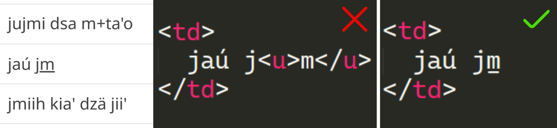 Lo mismo ocurre con las marcas tonales: sustituirlas por texto subrayado es una práctica igualmente problemática. El subrayado es un formato de estilo, no un carácter único. Los softwares lo tratarán como tal, y es muy probable que este formato se pierda al imprimir, copiar, cambiar de aplicación o mostrar el texto en medios digitales. Al seleccionar y copiar el texto, el estilo puede no preservarse y la marca tonal desaparece, haciendo que la palabra pierda su significado.